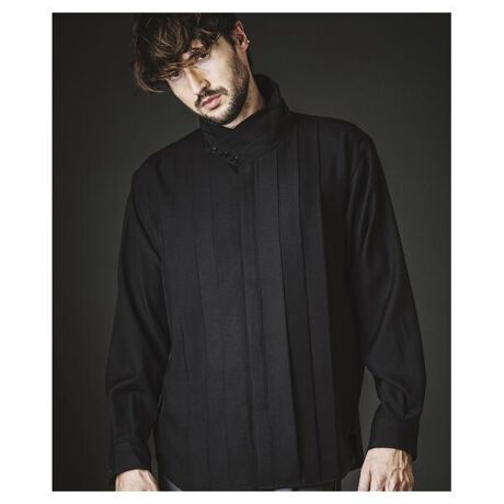 襟元とリンクさせたタックを身頃にも配置することで、シンプルなシャツに奥行きを持たせ、シルエットの存在感を強調。襟は寝かせてワイドカラーとしても着用でき、スタンド×ワイドの2WAY仕様で印象を自在に切り替えられる。