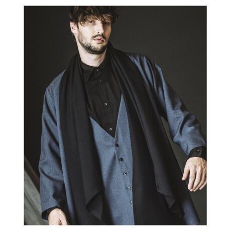 ベストの上にガウンを重ねたように見えるフェイクレイヤード構造が特徴で、さらにストール部分を一部切り離した可動域の広いデザインにより、多様なアレンジが可能。ストール先端のボタンホールと、身頃各所に配置されたボタンを組み合わせることで、巻き方・留め方・ drape(落ち感)を自在にコントロールでき、モードなスタイリングに奥行きを与える一着。