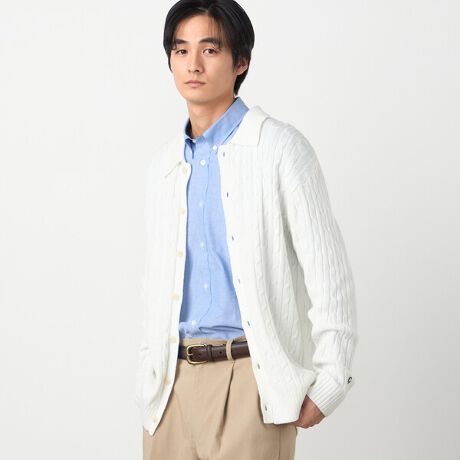 シャツのような衿付きでアウターのインナーカーディガンとしてもライトアウターとしてもお勧めの着回しのきくニットです。