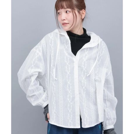 透け感のあるレース生地を使用した、軽やかな印象のフード付きシャツ。