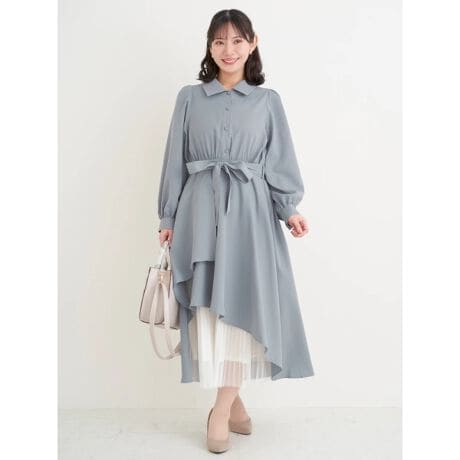 裾からのぞくプリーツチュールが大人フェミニンな印象のシャツワンピース。