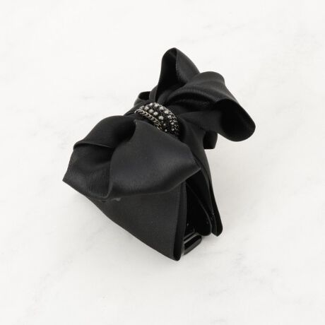 上品なリボンをボリューム感たっぷりに結び、中央にメタル+ラインストーンのリングをあしらったデザイン。