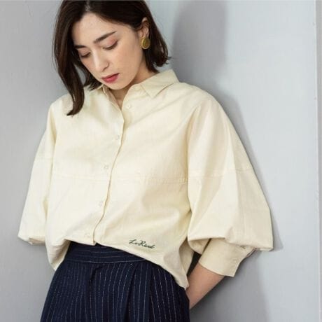・身頃に横に切り替えを入れて、ニュアンスのあるフォルムを出したシャツ。