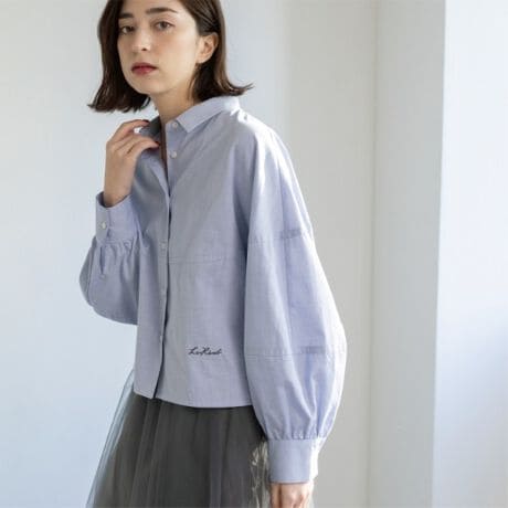 ・身頃に横に切り替えを入れて、ニュアンスのあるフォルムを出したシャツ。
