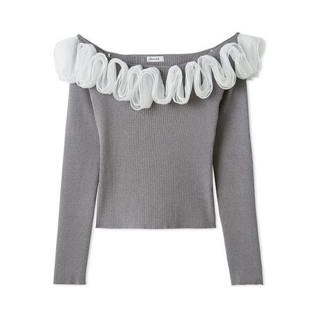 オフショルダーのリブニットプルオーバーに、チュールフリルで華やかなアクセントを加えました。