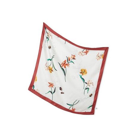 上品な艶感のシルクツイル生地のスカーフにあしらったのは、洋服などに使用している洗練されたフラワープリント。