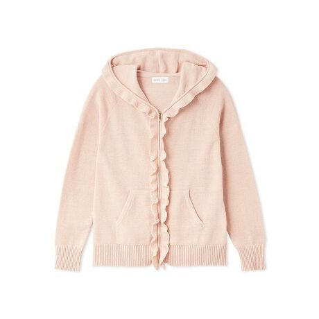 ファスナー付きのニットパーカに、花びらのような畔編みのフリルでアクセントを添えた程良くカジュアルに着用いただけるアイテム。
