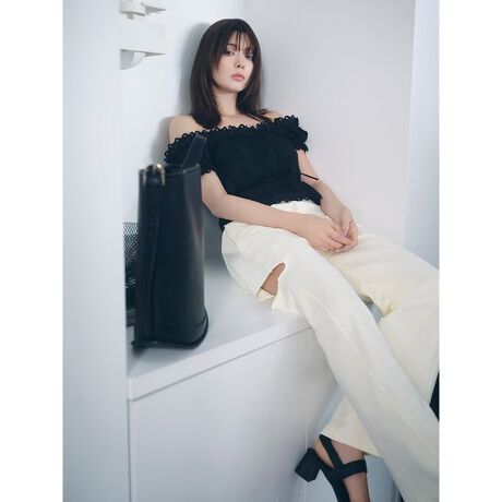 ウエスト部分に前開きのようなステッチを入れることで、端正なムードをプラスしました。