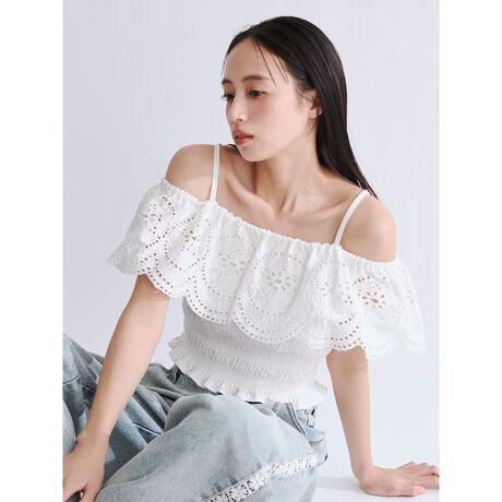 FRAY I.Dオリジナルの刺繍レースを衿ぐりに施した、特別感溢れるオフショルダーブラウス。