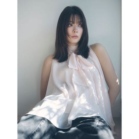 上品な肌見せを叶えるホルターネックブラウスは、セットになった共布のワイドリボンがポイント。