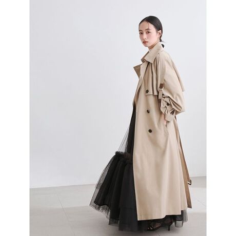 撥水機能付きシャンブレー生地を使用した、ロングトレンチコート。