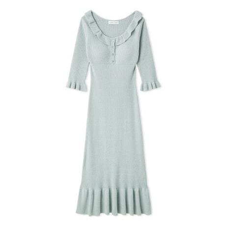 これから春先にかけて活躍しそうな、胸元に飾りボタンを付けた七分袖のリブニットワンピース。