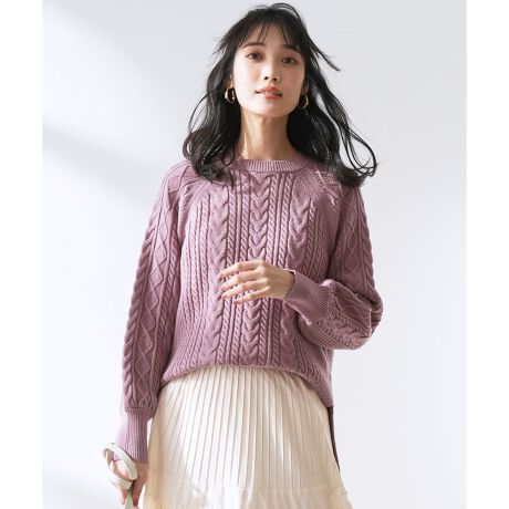 ・立体感のあるケーブルの編み柄が美しいニットプルオーバー ・着こなしやすいゆとりのあるフォルム感・裾スリットと前後差のある着丈でトップスアウトでもサマ見えが叶う・肩回りがスッキリ見えするラグラン袖