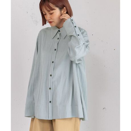 とろみのあるレーヨンナイロンツイル素材で仕立てたフレアシャツ。裾は太巾の切り替えで程よくハリを持たせ、立体感のあるシルエットに仕上げました。左袖には切り替えを入れ、小さなタブをあしらっています。長めの衿先が新鮮で、重ね着をしてもさりげないアクセントに。袖口のあきを長めに取っているため、ボタンを開けてラフに羽織る着こなしも◎。寒い時期にはインナーにニットを重ねたレイヤードスタイルもおすすめです。