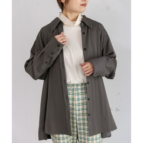 とろみのあるレーヨンナイロンツイル素材で仕立てたフレアシャツ。裾は太巾の切り替えで程よくハリを持たせ、立体感のあるシルエットに仕上げました。左袖には切り替えを入れ、小さなタブをあしらっています。長めの衿先が新鮮で、重ね着をしてもさりげないアクセントに。袖口のあきを長めに取っているため、ボタンを開けてラフに羽織る着こなしも◎。寒い時期にはインナーにニットを重ねたレイヤードスタイルもおすすめです。