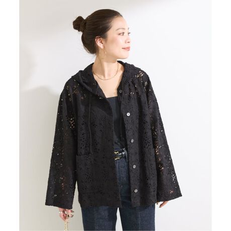 立体感のある刺繍と繊細な透け感が、軽やかで涼しげな印象を演出します。フード付きのフロントボタンシャツ仕様で、カーディガン感覚でも着用できる軽めの羽織りにぴったりなアイテムです。オーバーサイズシルエットがほどよい抜け感を生み、レース素材でも甘くなりすぎず、カジュアルからきれいめまで幅広くスタイリングに取り入れやすい一枚です。