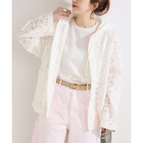 立体感のある刺繍と繊細な透け感が、軽やかで涼しげな印象を演出します。フード付きのフロントボタンシャツ仕様で、カーディガン感覚でも着用できる軽めの羽織りにぴったりなアイテムです。オーバーサイズシルエットがほどよい抜け感を生み、レース素材でも甘くなりすぎず、カジュアルからきれいめまで幅広くスタイリングに取り入れやすい一枚です。
