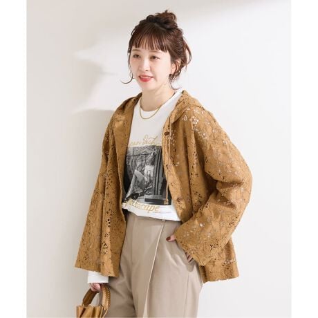 立体感のある刺繍と繊細な透け感が、軽やかで涼しげな印象を演出します。フード付きのフロントボタンシャツ仕様で、カーディガン感覚でも着用できる軽めの羽織りにぴったりなアイテムです。オーバーサイズシルエットがほどよい抜け感を生み、レース素材でも甘くなりすぎず、カジュアルからきれいめまで幅広くスタイリングに取り入れやすい一枚です。
