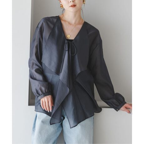 春のスタイリングに取り入れたい、シアー感と光に当たった時の艶感が素敵なフリルブラウス。