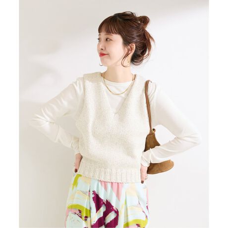 控えめなラメ糸を織り混ぜたミックス調のカラー糸を使用し、派手すぎずスタイリングして頂けます。シャツやロンT合わせなど、レイヤードがしやすく、季節の変わり目にも活躍するアイテムで、前後2wayでも着用できる着回し力の高い一枚となっております。