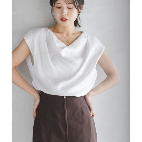 顔周りに贅沢にドレープを使用したデザインで、更にショルダー部分にも生地がかぶさるように設計されており、着映えと腕などの気になる部分のカバーを両立。