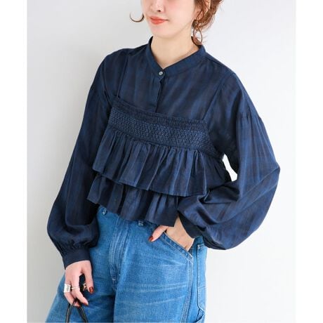 ウエストシェイプしたシルエットのブラウスはスタンドカラーでシンプルなディテールにし、セット着でも甘すぎないテイストにしており単品でも着回しができます。フリルキャミソールはTシャツやカットソーとレイヤードしてもおすすめです。