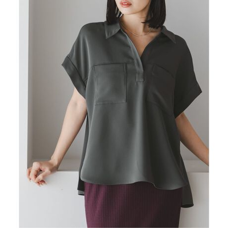 落ち感のある素材や潔く開いたVネックなど女性らしいデザインは継続で、胸元には大きめのポケットを取り入れたりと程よく大人っぽさを加えたデザインは健在。