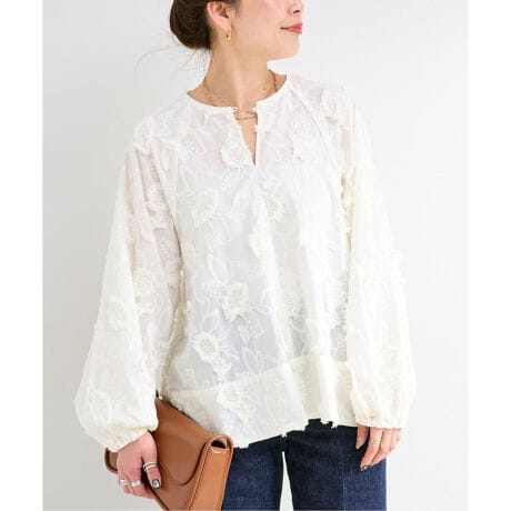 フラワー刺繍を施した3Dレース生地を使用し、キレイめなボトム合わせでも十分に着映えするアイテムになっています。内側に付いた隠し釦を開けてキーネック風にも着られ、ボリュームを持たせた袖の膨らみが可愛らしいチュニックです。