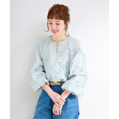 フラワー刺繍を施した3Dレース生地を使用し、キレイめなボトム合わせでも十分に着映えするアイテムになっています。内側に付いた隠し釦を開けてキーネック風にも着られ、ボリュームを持たせた袖の膨らみが可愛らしいチュニックです。