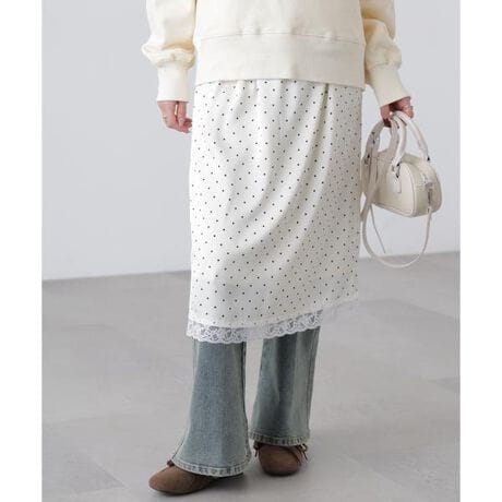 動くたびにキレイな表情を見せる、しなやかなサテン素材のミディスカート。黒ベースとホワイトベースはトレンドのドット柄でレトロな雰囲気を演出。無地はワッシャー感のあるサテン素材なのでカジュアルスタイルにもおすすめです。ランジェリーライクな華奢なレースを裾にあしらい、ウエスト部分にはピコゴムでガーリーさをプラス。ウエストはぐるりゴム仕様でストレスフリーなはき心地です。ロングブーツにミドルゲージニット合わせでカジュアルな着こなしが気分!デニムとレイヤードしてカジュアルダウンさせても今年らしくておすすめです。※モデルの着用画像の場合、光の当たり具合により、実際の色味と異なって見えることがございます。色味は、商品単体の画像をご参照ください。