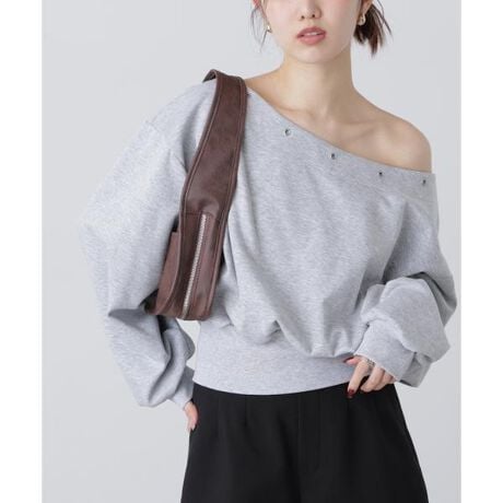 大きく開けた襟ぐりにスタッズを施し、Y2Kムードを加えたスウェット。そのまま着用するとデコルテ見せ、少し肩をずらして落とすとワンショルダーとして着用できる2way仕様。ギャザー入りのルーズなシルエットながら、袖口と裾はきゅっと締まっているので、着丈のバランスが取りやすいです。フリルスカートなど甘さのあるボトムスと合わせたトレンド感のあるスタイルがおすすめ。デニムパンツと合わせたヘルシーなスタイリングも楽しめます。※モデルの着用画像の場合、光の当たり具合により、実際の色味と異なって見えることがございます。色味は、商品単体の画像をご参照ください。