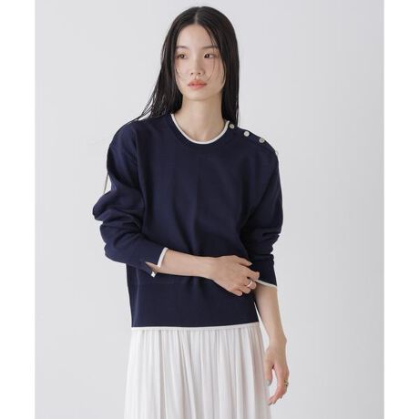 ゴールドの釦と配色使いが顔まわりに華やかな印象を与えるニット。UVカット機能付きと、ご自宅で洗濯洗いができるのも嬉しいポイント!程よい肉感とハリ感のあるキレイめなアイテムなので、通勤からちょっとしたお出掛けまで幅広く活躍する一着です。