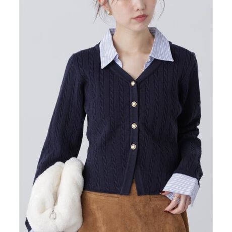 Vネックケーブル編みニットとシャツをレイヤードしたように見せてくれるドッキングニット。襟と袖カフスは縫い合わせており、一枚でスタイリングが完成します。ゴールドカラー釦がポイント。体にフィットするウエストシェイプしたラインで、すっきりとした印象に。ニット地は伸縮性があり、編地がしっかりとしているので垂れにくいです。プリーツスカート合わせでスクールライクに、ボリューム感のあるバレルパンツやスウェットパンツ、カーブデニムと合わせたメリハリのあるスタイリングもおススメです。※モデルの着用画像の場合、光の当たり具合により、実際の色味と異なって見えることがございます。色味は、商品単体の画像をご参照ください。