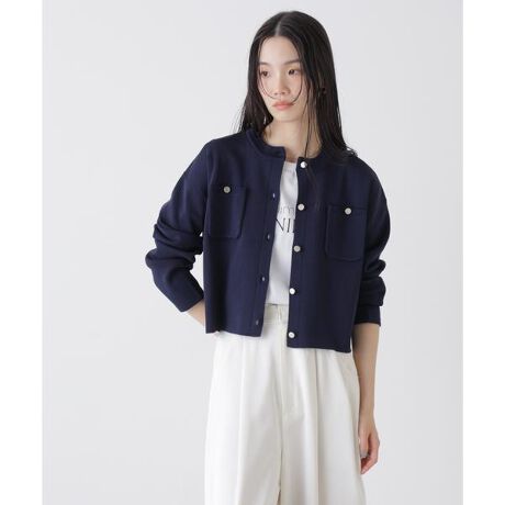 胸ポケットデザインがポイントのジャケット風ニットカーディガン。UVカット機能付きと、ご自宅で洗濯洗いができるのも嬉しいポイント!フロントのゴールド釦が華やかな印象で、通勤やオフィスシーンちょっとしたお出掛けまで幅広く活躍します。