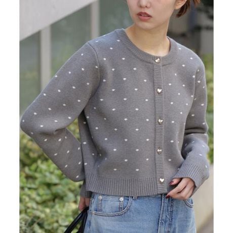 コットンアクリルのダブルジャガード編みをミドルゲージで仕上げた、ふっくらとした風合いのカーディガン。主張しすぎない小さめのドット柄と、ゴールドカラーのハート型ボタンが愛らしさを演出しつつ、コットン混素材で程よくカジュアルな印象に見せてくれます。デニムと合わせたカジュアルスタイリング、バルーンシャツミニワンピース(ブランド品番131-6140201)合わせもおすすめです。※モデルの着用画像の場合、光の当たり具合により、実際の色味と異なって見えることがございます。色味は、商品単体の画像をご参照ください。