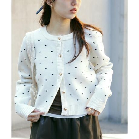コットンアクリルのダブルジャガード編みをミドルゲージで仕上げた、ふっくらとした風合いのカーディガン。主張しすぎない小さめのドット柄と、ゴールドカラーのハート型ボタンが愛らしさを演出しつつ、コットン混素材で程よくカジュアルな印象に見せてくれます。デニムと合わせたカジュアルスタイリング、バルーンシャツミニワンピース(ブランド品番131-6140201)合わせもおすすめです。※モデルの着用画像の場合、光の当たり具合により、実際の色味と異なって見えることがございます。色味は、商品単体の画像をご参照ください。