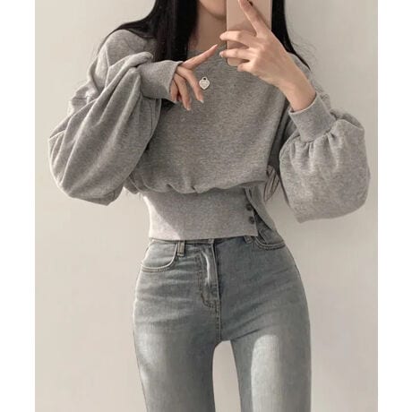 無地ながらも着映える、韓国ムードのカジュアルトップス。