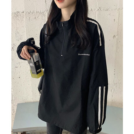 ・首元はすっきりとしたスタンドカラー×ハーフジップ仕様で、抜け感と着脱のしやすさを両立。