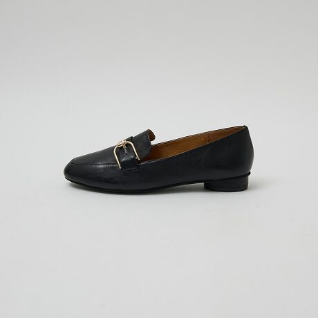 オリジナルで生み出したバックルを引き立たせる、シンプルなデザインのローファー。