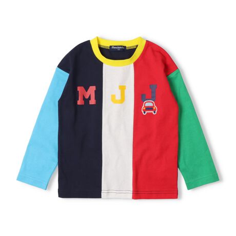 カラフルな配色使いの前切替デザインの長袖Tシャツ、ロンT。アルファベットロゴに車のワッペン付き。【アイテム】トップス カジュアル お洒落 オシャレ かっこいい かわいい 可愛い 普段着 デイリーウェア お出かけ着 お外着 お外遊び着 子ども服 こども服 男児 男の子 ボーイズ キッズ ベビーサイズ トドラーサイズ 幼稚園 保育園 小学校 通園 通学 小学生 2026年春夏物新作 丸高衣料 ロングスリーブ 長袖 カー ムージョンジョン コットン100% 綿100%