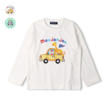 車に乗ったキリンやライオン、ゾウのプリントがムージョンジョンらしくて可愛い長袖Tシャツ、ロンT。車のチェック柄部分は布帛のアップリケになっているのもポイント!【アイテム】トップス カジュアル お洒落 オシャレ かっこいい かわいい 可愛い 普段着 デイリーウェア お出かけ着 お外着 お外遊び着 子ども服 こども服 男児 男の子 ボーイズ キッズ ベビーサイズ トドラーサイズ 幼稚園 保育園 小学校 通園 通学 小学生 2026年春夏物新作 丸高衣料 ロングスリーブ 長袖 ホワイト 白色 ライトグリーン 薄緑色 きりん ぞう 動物 アニマル コットン100% 綿100%