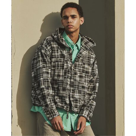 インドで生産されたマドラスチェックのパッチワーク生地を使用し、フード付きシャツ型にデザインした一着。