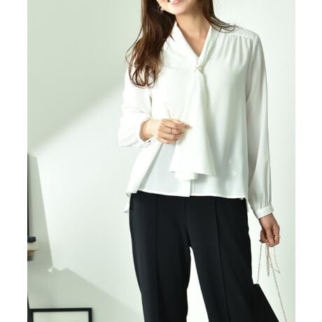 綺麗な落ち感のあるポーラ素材を使用したタイブラウス。ネックレスが無くても胸元を上品に演出してくれ、1枚着としてはもちろん、ジャケットのインナーにも◎何と言ってもポイントは、スカーフリング付きが嬉しいアイテムです。さらにリングは裏表使用できる2WAY。シーンやスタイルによって使い分けが可能です。リングを使用したキレイ目なスタイリングはもちろん、リボンに結んだり、シックに垂らすのも素敵です。
