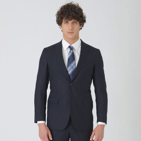 汎用性の高い紺無地素材は、ビジネスから冠婚葬祭まで幅広いシーンでご着用いただけます。上質なウール原毛の風合いを引き出した、美しい光沢感と上品ななめらかさが特徴の素材です。経糸緯糸共に双糸使いにする事で、ハリコシのある立体的なスーツに仕上がっております。