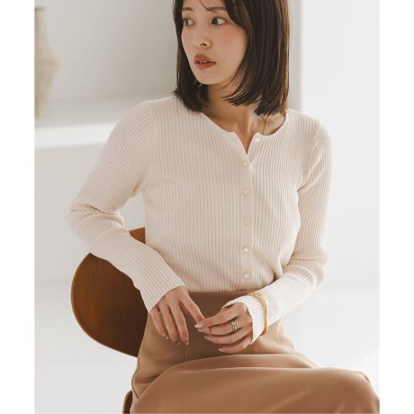 細ピッチのランダムリブと同カラーで揃えたパールボタンが上品ムード漂うクルーネックカーディガン。