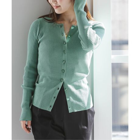 細ピッチのランダムリブと同カラーで揃えたパールボタンが上品ムード漂うクルーネックカーディガン。