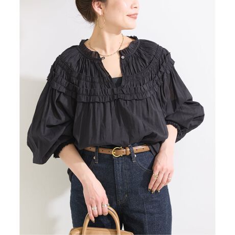 インド綿素材のシアーなコットンボイルを使用したフェミニンな大人ブラウス。甘めな印象を受けますが、素材感が柔らかく華やかな顔周りのフリルも派手過ぎず、袖口にもフリルをあしらった着映えするディテールになっています。前後逆に釦を開けてスキッパー風に着用すると、より抜け感が出た着こなしになりおすすめです。