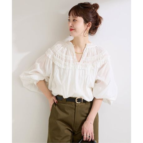 インド綿素材のシアーなコットンボイルを使用したフェミニンな大人ブラウス。甘めな印象を受けますが、素材感が柔らかく華やかな顔周りのフリルも派手過ぎず、袖口にもフリルをあしらった着映えするディテールになっています。前後逆に釦を開けてスキッパー風に着用すると、より抜け感が出た着こなしになりおすすめです。