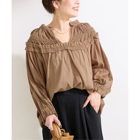 インド綿素材のシアーなコットンボイルを使用したフェミニンな大人ブラウス。甘めな印象を受けますが、素材感が柔らかく華やかな顔周りのフリルも派手過ぎず、袖口にもフリルをあしらった着映えするディテールになっています。前後逆に釦を開けてスキッパー風に着用すると、より抜け感が出た着こなしになりおすすめです。