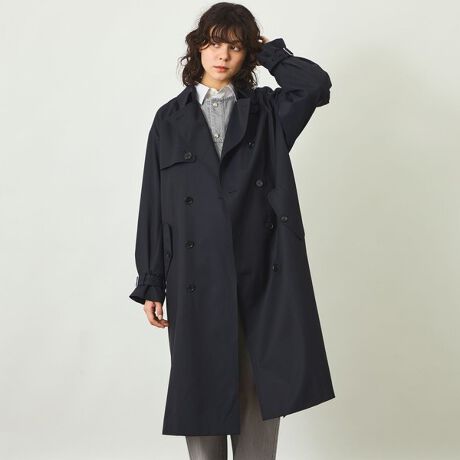 上品なポリエステルウールギャバジン素材を使用したダブルブレストトレンチコート。クラシカルなトレンチコートをオーバーサイズながらバランスの崩れないシルエットに仕上げています。襟にはチンストラップ付き。雨風が入るのを防ぎ、襟のバタつき抑える役割があります。また袖ベルトを絞り、プッシュアップしてもこなれ感が出ます。軽量感のある素材を使用しているので、ざっくりと羽織っていただくのがお勧めです。